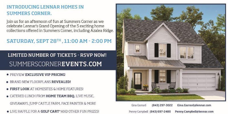 INTRODUCING LENNAR HOMES IN SUMMERS CORNER Join us for an afternoon of fun at Summers Corner as we celebrate Lennar’s Grand Opening of the 5 exciting home collections offered in Summers Corner – including Azalea Ridge! SATURDAY, SEPT 28TH, 11:00 AM – 2:00 PM LIMITED NUMBER OF TICKETS – RSVP NOW! • Preview exclusive VIP read more